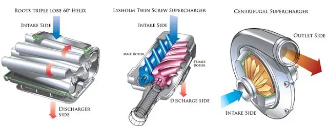 Twin-screw superchargers and Roots-type superchargers are two common types of positive displacement superchargers used to increase the power output of an internal combustion engine. Here are the key differences between them: