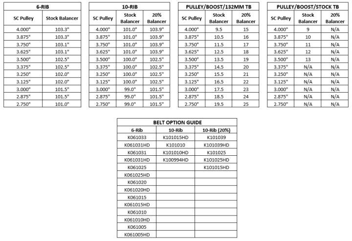 Whipple Superchargers, the twin-screw supercharger leaders have developed a race proven 10-Rib belt system that will work with both stock engines as well as highly modified engines. Featuring the industry leading ATI balancer (stock diameter or 20% OD), heavy-duty Whipple billet tensioner, lightweight pocketed hard coat anodized aluminum pulleys, adjustable idler pulley and a Gates belt that let's you can go down the 1/4 mile with confidence.